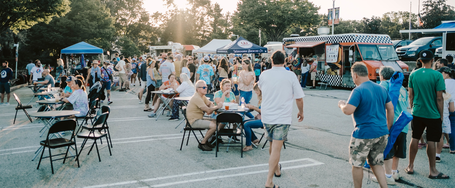 The lowest level of the parking lot is transformed into a beer garden with food trucks offering a variety of delicious options to enjoy during the show. Grab drinks from the Rising Sun Presents Bars, which offer a variety of local craft brews, canned cocktails, and water.
